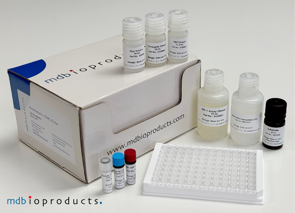The Uromodulin Glycoprotein ELISA kit is a 96-Well enzyme-linked immunosorbent assay used for the quantitative determination of Uromodulin Glycoprotein (THP) in urine, serum and plasma samples.
