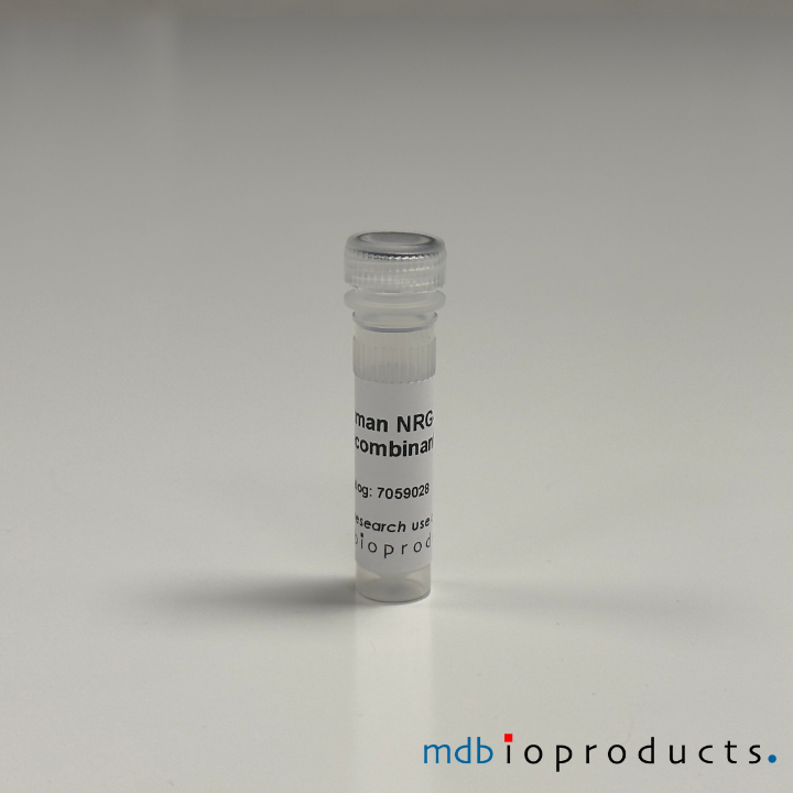 Heregulin-beta 1, also known as neuregulin-1 (NRG-1), is a member of the epidermal growth factor (EGF) family and acts as a ligand for ErbB receptor tyrosine kinases. Derived from alternatively spliced genes (NRG1, NRG2, NRG3, and NRG4), heregulin-beta 1 is crucial for the development of the nervous system, heart, and mammary glands. It is expressed in neuronal cells and influences their growth and differentiation during development and wound healing. Heregulin-beta 1/ErbB signaling is essential for cardiovascular development and heart protection against ischemic injury, promotes invasiveness and metastasis in breast cancer cells, and supports the growth and maintenance of human embryonic stem cells.